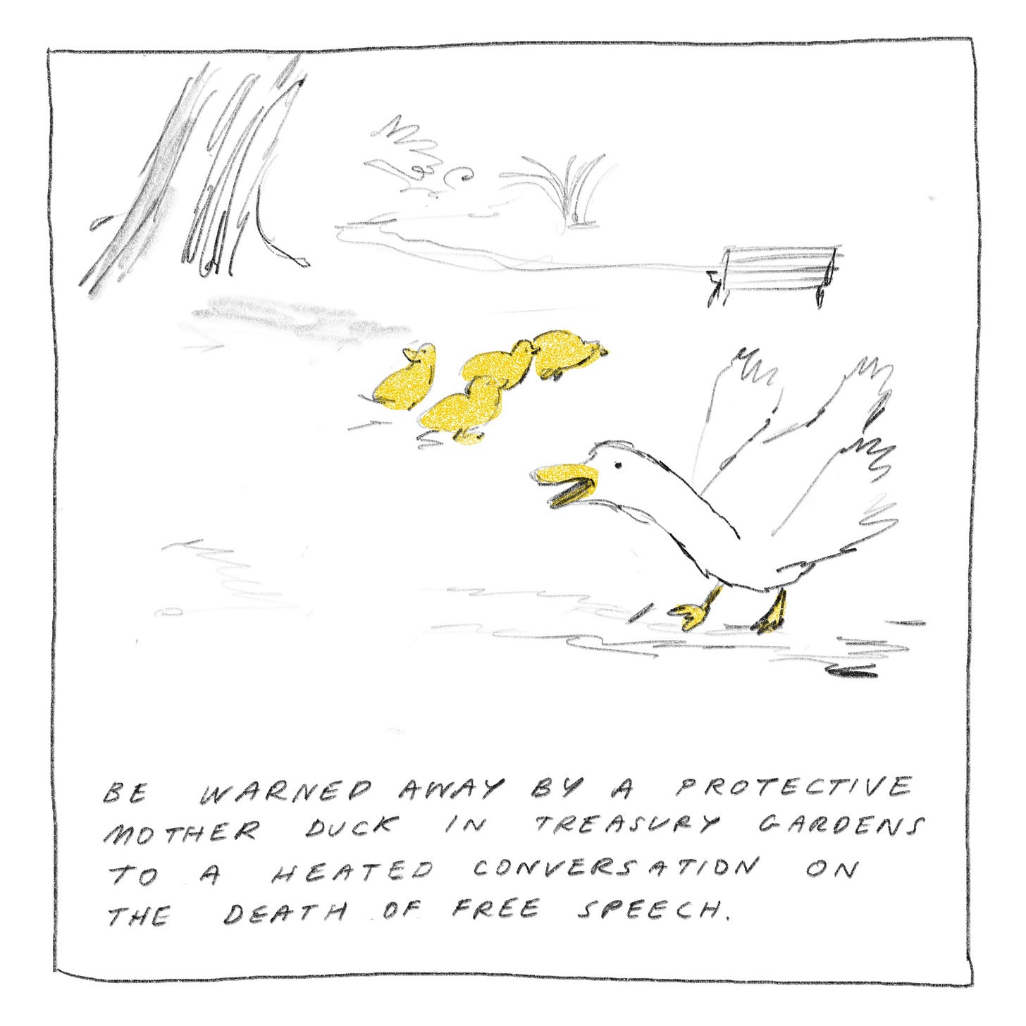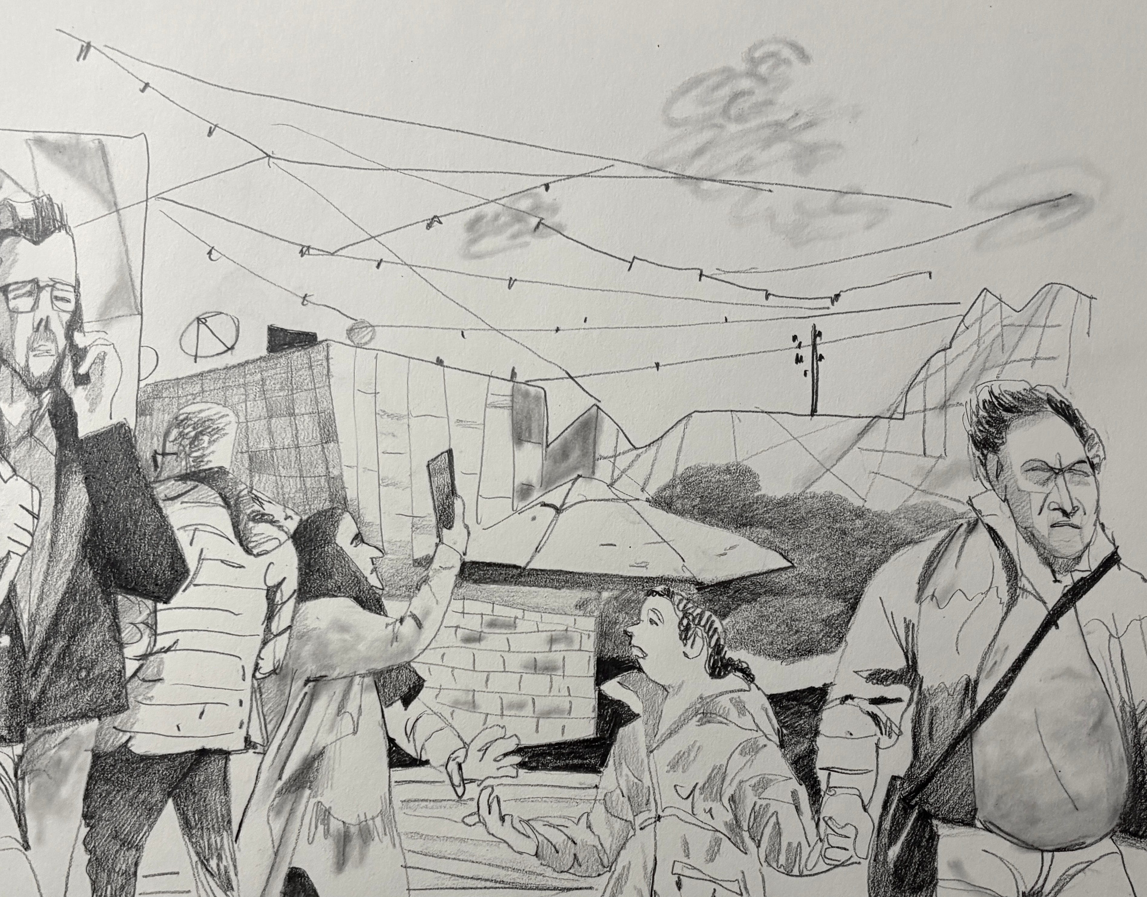 Since my hearing is somewhat dimmed right now, I’ve been paying more attention to visuals. Wanting to get back to doing some standalone drawings. I’m currently walking around the city a lot pushing a pram. And sometimes I try to take photos while holding the pram, which results in some interesting angles. I didn’t quite capture this scene in the photo but I found it quite arresting so I thought I would try to draw it. This was the third attempt.