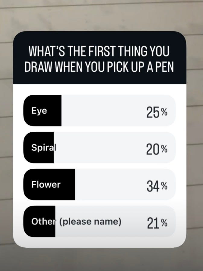This week follows up a little from last one. Someone commented that they like to draw spirals when they first pick up a pen and I thought there must be a few different things that people tend to draw and it probably says something about them. So I did some research via Instagram poll with some very interesting results: