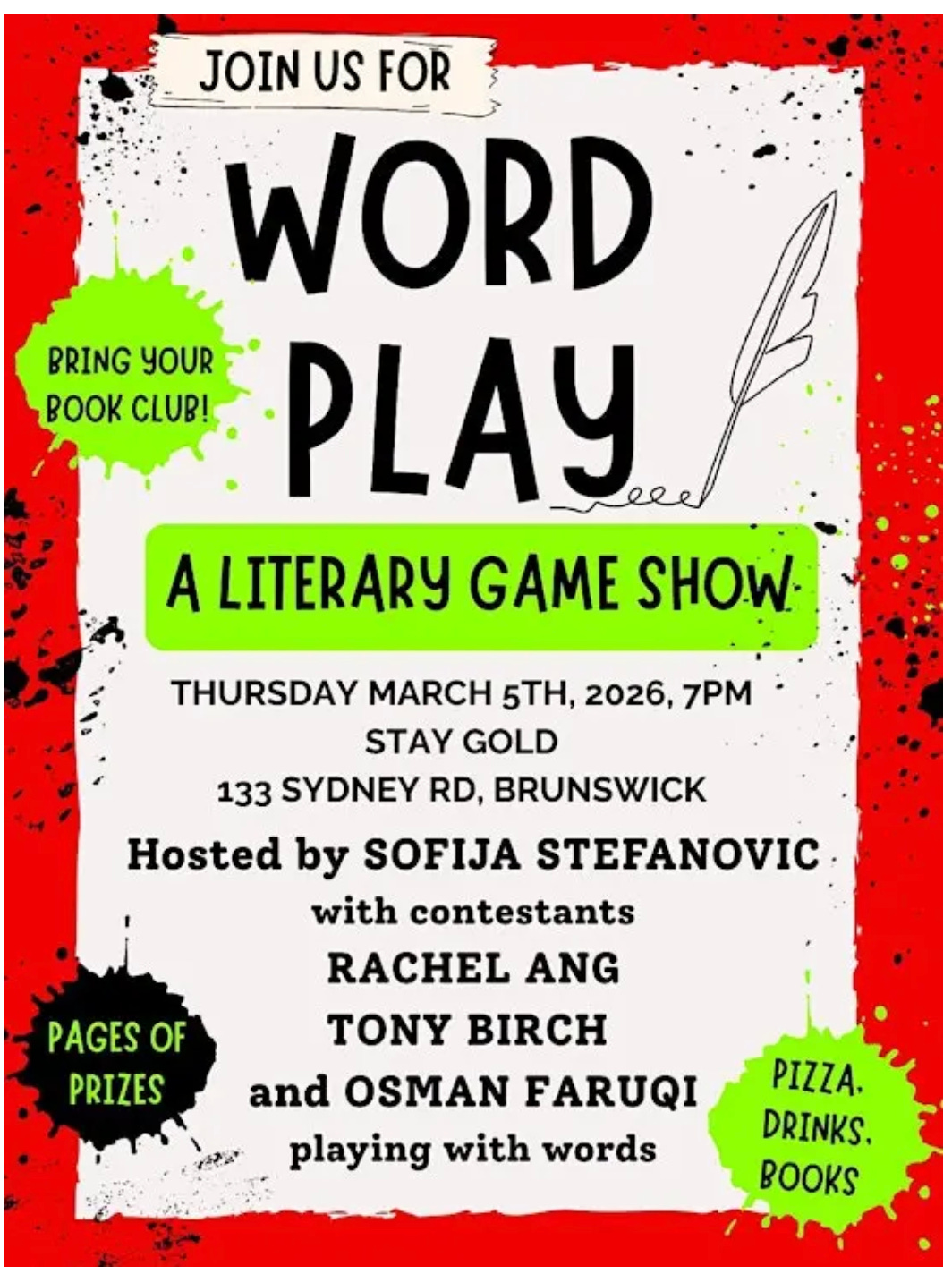 This week, Rachel was on a panel at the Fitzroy Town Hall on the topic of Matrescence, which by all accounts went very well. It was recorded so I will post the link when it comes through. In the meantime she’s also going to be at this event in a few weeks, which sounds very fun if you like quizzes and word games etc!